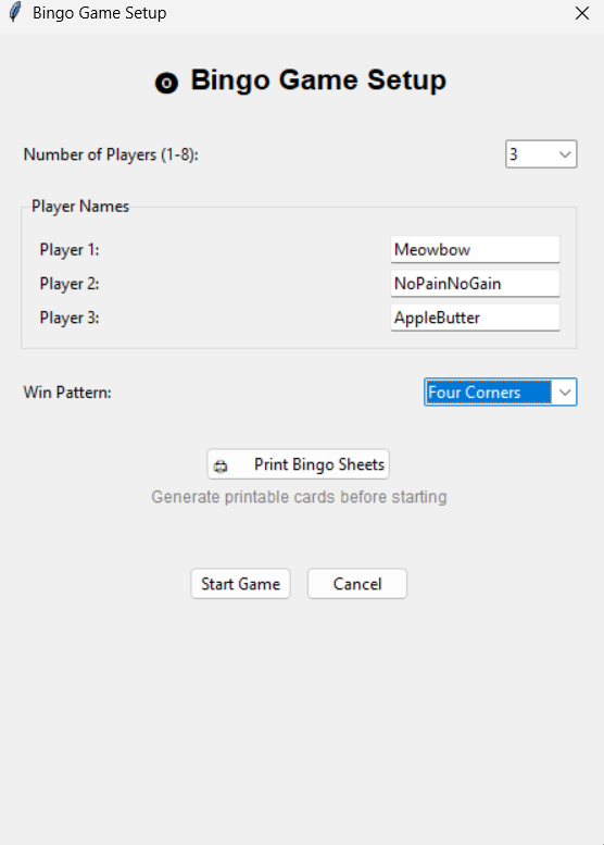 This Bingo program allows up to eight players on the screen to play bingo at once. Each player may be named, and scores can be tracked between sessions! Perfect program for Bingo parties, both online and in person. This lightweight program can run on older computers and hardware fine! You can select from multiple win patterns and name each player.